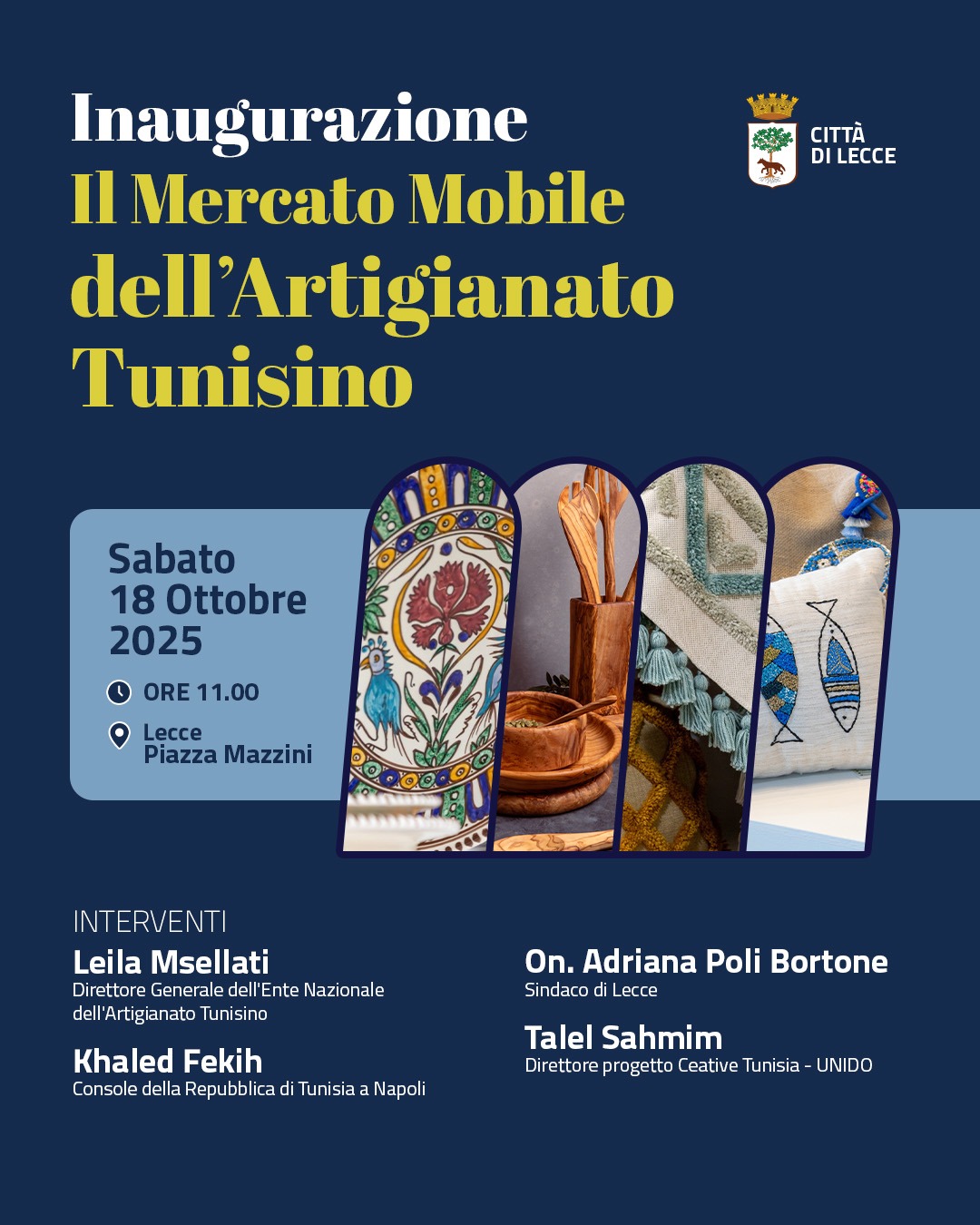 Tomorrow, Saturday, October 18, at 11:00 a.m., in Piazza Mazzini, Lecce, the official inauguration of the Tunisian Mobile Handicraft Market will take place. The event is organized by the Municipality of Lecce in collaboration with the National Office of Tunisian Handicrafts (ONAT) and the United Nations Industrial Development Organization (UNIDO), as part of the Armonie del Mediterraneo Festival.