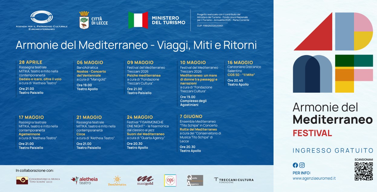 “Armonie del Mediterraneo – Viaggi, Miti e Ritorni” nasce come un racconto in movimento, un attraversamento di storie, suoni e memorie che restituisce il Mediterraneo nella sua dimensione più profonda: luogo di incontri, partenze e ritorni, spazio vivo di identità plurali e culture in dialogo.