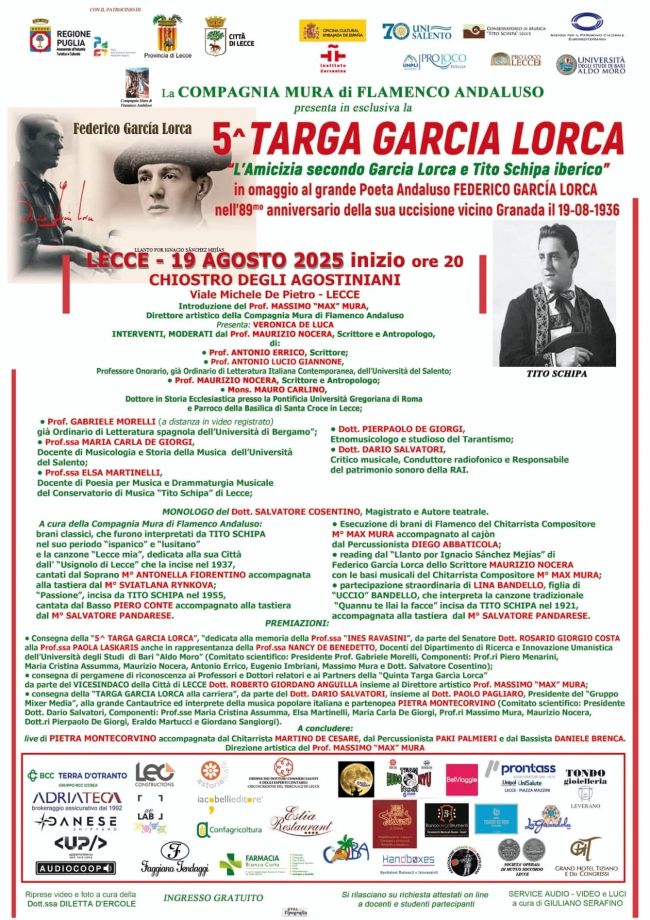 LECCE – L’Agenzia per il Patrimonio Culturale Euromediterraneo consolida il proprio ruolo di regia istituzionale e supporto scientifico nel panorama culturale internazionale promuovendo la quinta edizione della “Targa Memorial García Lorca”. L'evento, organizzato dalla Compagnia Mura di Flamenco Andaluso con il sostegno strategico dell'Agenzia, si terrà martedì 19 agosto presso il Chiostro degli Agostiniani, celebrando l'anniversario della scomparsa del poeta di Granada.